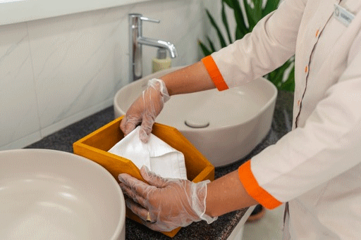 تبدأ عملية إعادة التدوير خطوة بخطوة بجمع أغطية السرير التالفة، والتي يتم نقلها بعد ذلك إلى الخياط الموجود في الشركة. تم قطع كل ملاءة سرير بحجم كينج بعناية وتصنيعها في حوالي 60 قطعة من المناشف مقاس 10 × 10 بوصة. يقوم الخياط بتقطيع ملاءة السرير إلى 11 × 11 بوصة، ويطوي بوصة واحدة على كل جانب، ويخيط الحواف لمنع الاهتراء. وهذا يضمن استخدام كل قطعة من القماش إلى أقصى إمكاناتها، دون استخدام أي مواد كيميائية – فقط الغسيل الشامل قبل وضعها في الحمامات. تعتبر بياضات الأسرّة، نظرًا لقدرتها العالية على الامتصاص، مثالية لعملية إعادة التدوير هذه. المعدات الوحيدة المطلوبة هي ماكينة خياطة وأيدي الخياط الماهرة، مما يجعل هذه المبادرة عالية الكفاءة ومستدامة. وللحفاظ على معايير الصحة والسلامة، يستخدم كل منفذ أكياسًا منفصلة لحمل مناشف الغسيل الطازجة والمتسخة، مما يمنع انتقال التلوث. يستخدم قسم الغسيل آلة سعة 8 كجم مخصصة لغسل هذه الملابس، والتأكد من أنها تلبي معايير النظافة قبل الاستخدام.