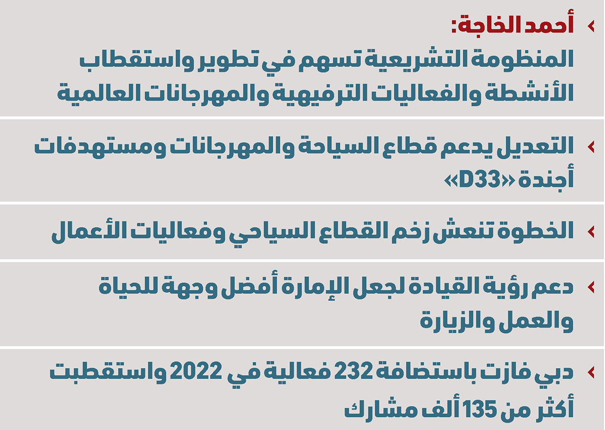 «تدعم التوجيهات السديدة لقيادتنا الرشيدة باستمرار الأهمية المتنامية لقطاع الفعاليات ودورها الرئيسي في تحقيق التنمية الاقتصادية المستدامة، وتأتي التعديلات التنظيمية لتؤكد أهمية هذا القطاع، وتسهم في تسهيل عملية تطوير واستقطاب الأنشطة والفعاليات الترفيهية والمهرجانات المختلفة، وبالتالي زيادة أعداد الجماهير والزوار وتشجيع العاملين ضمن القطاع على تنظيم فعاليات مميزة ومبتكرة».