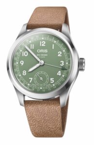يمنح الميناء الأخضر الترابي لهذه الساعة Big Crown Pointer Date بقياس 40 مم حضوراً جديداً ضمن التشكيلة. صُنعت العلبة من الفولاذ المقاوم للصدأ، ويكتمل التصميم بسوار جلدي مستدام مصنوع يدوياً من جلد الغزال بالتعاون مع Cervo Volante. تعمل الساعة بحركة أوريس الأوتوماتيكية. Calibre 403، لتوازن بين الطابع التراثي والحس المعاصر