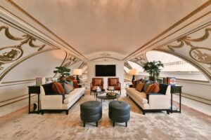 وقامت شركة سانت إدوارد بتحديث التصميم التقليدي للشقة من خلال إنشاء منطقتي ميزانين جديدتين، ويمكن الوصول إلى الأول من غرفة الاستقبال عبر درج حلزوني، حيث توجد مكتبة ومساحة مخصصة للدراسة تفيض بالتفاصيل العريقة الساحرة. وساعدت الأسقف المنحنية المنخفضة في الجزء الخلفي من الشقة على إنشاء ركن مشروبات خاص وغرفة ألعاب مميزة. وتتميز الغرفتان بتصميم غني بالألوان والأقمشة النابضة بالحيوية، مما يجعل منهما مساحة دافئة ومناسبة للاجتماعات الصغيرة.