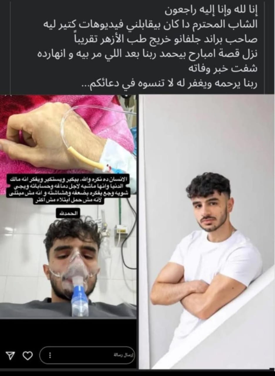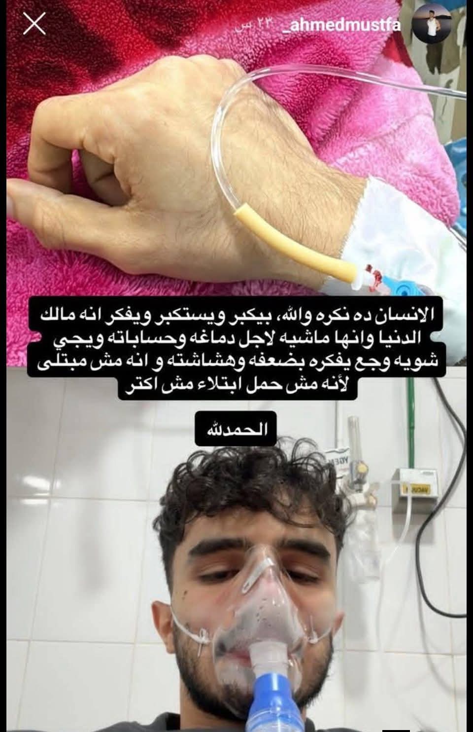 وكان آخر ما نشره الشاب قبل ساعات من وفاته، صورة على خاصية الاستوري بمنصة انستجرام، أظهرت يده متصلة بالمحاليل الطبية خلال تلقيه العلاج بالمستشفى، وأخرى خلال تلقيه لجلسات الأكسجين لتحسين ضيق التنفس الذي يعانيه.