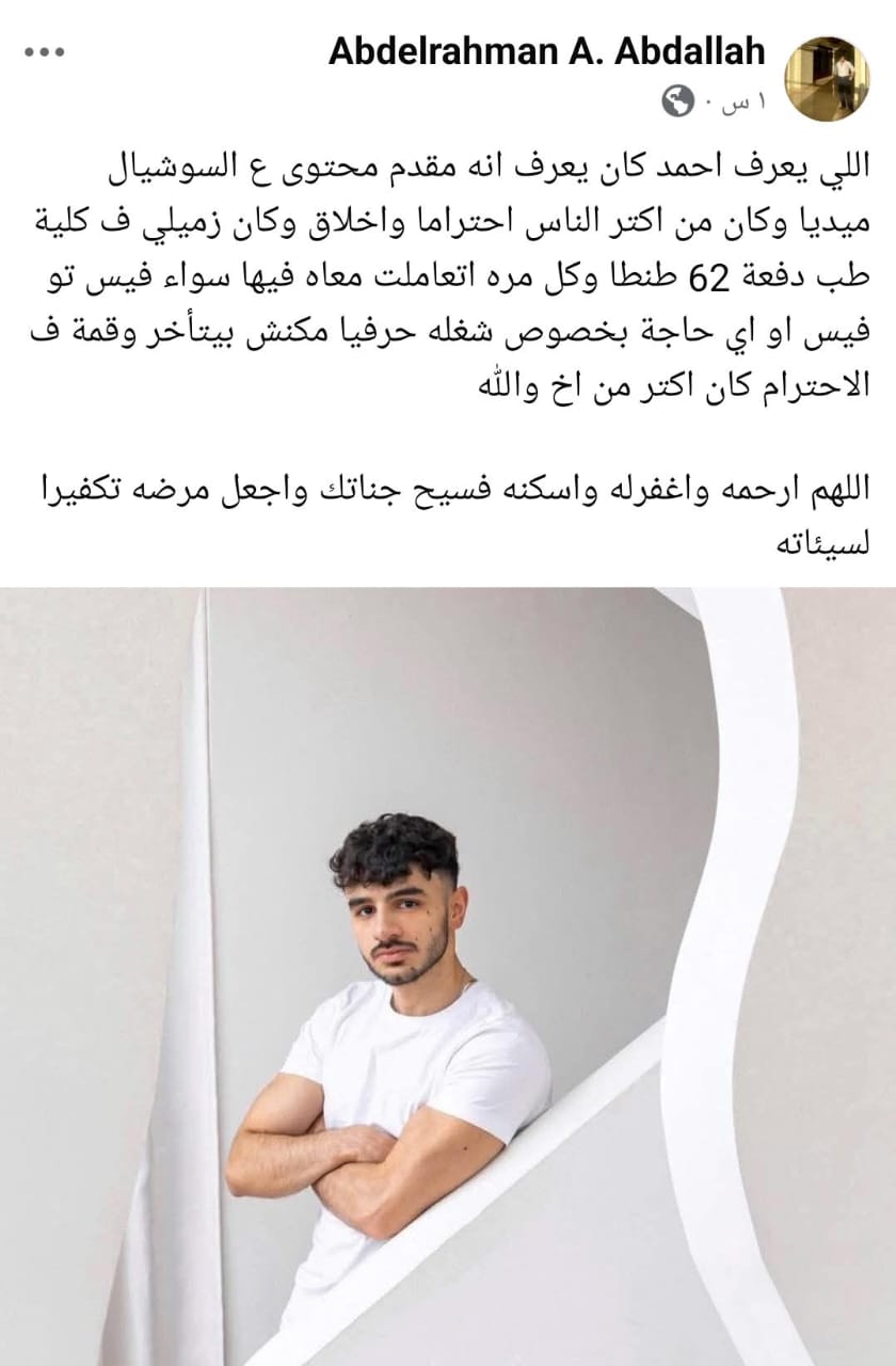 حالة من الحزن والصدمة خيمت على رواد مواقع التواصل الاجتماعي، بعد وفاة الشاب أحمد مصطفى، أحد أبرز صناع المحتوى وصاحب إحدى ماركات الملابس المحلية الشبابية.
