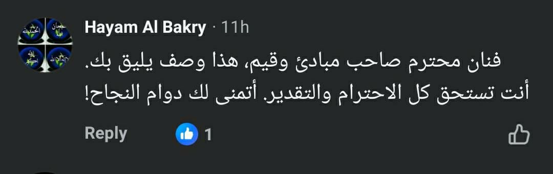 وكتب حساب آخر باسم “هيام بكري”: “فنان محترم صاحب مبادئ وقيم، هذا وصف يليق بك، أنت تستحق كل الاحترام والتقدير، أتمنى لك دوام النجاح”.