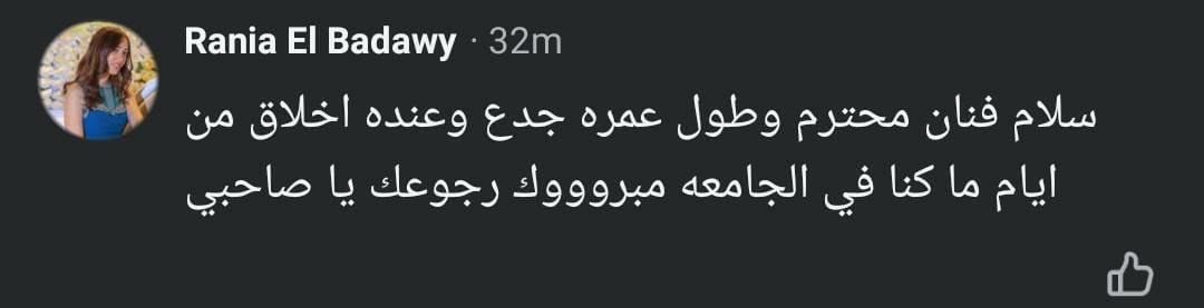 وكتبت رانيا البدوي، إحدى صديقاته أيام الجامعة: “سلام فنان محترم وطول عمره جدع وعنده أخلاق من أيام ما كنا في الجامعة، مبروك رجوعك يا صاحبي”.
