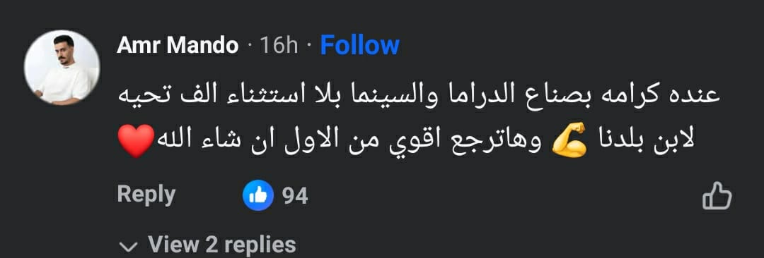 وكتب حساب باسم “عمر ماندو”: “عنده كرامة بصناع الدراما والسينما بلا استثناء، ألف تحية لأبن بلدنا وهترجع أقوى من الأول إن شاء الله”.